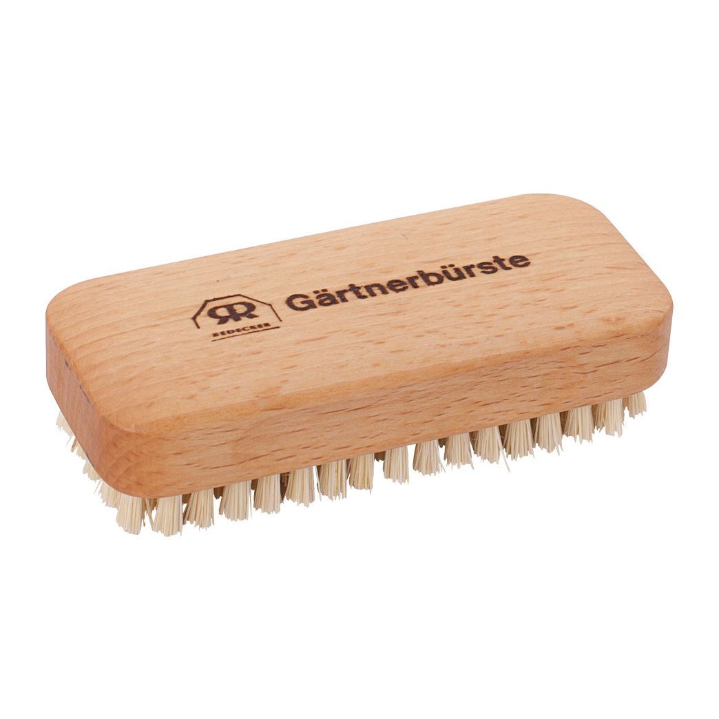 Gärtnerbürste mit Aufdruck aus geöltem Buchenholz mit Borsten aus Fibre-Fasern, Größe: 10,5 x 4,5 cm.
